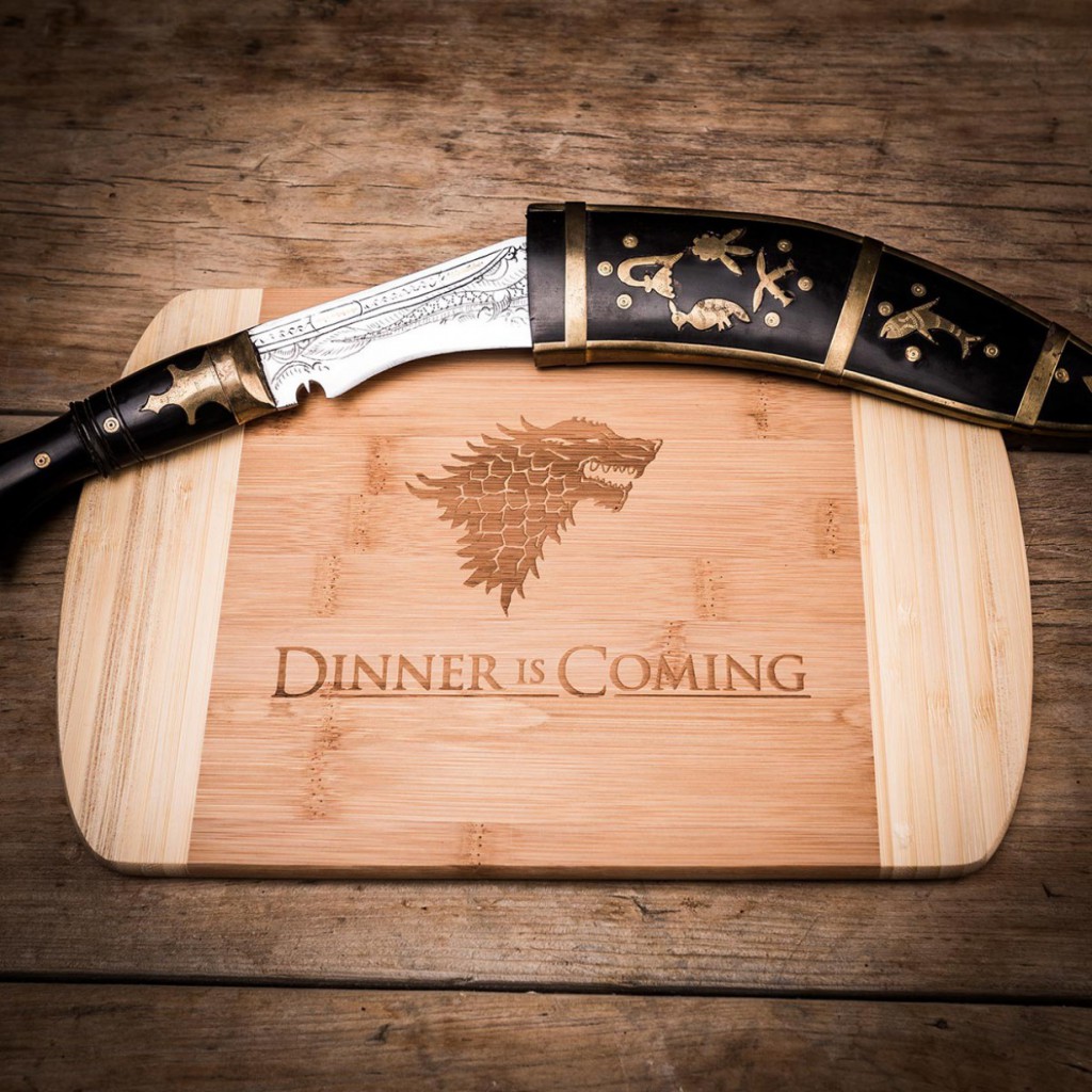 Schärft die Dolche, wetzt die Messer: Dinner is coming. Dieses von Game of Thrones inspirierte Schneidebrett hat den Haus-Spruch der Starks – in leicht abgeänderter Form – eingraviert. Daneben ziert das Wappen des Hauses das 475 Gramm schwere Stück Bambusholz: der Kopf des grimmigen Schattenwolfes. Ideal für das Festmahl nach einer gewonnenen Schlacht, ob im Sommer oder Winter. Gibt’s für € 29,95 bei radbag.de.